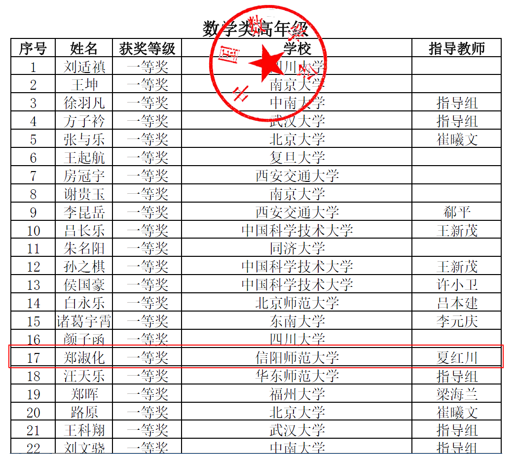 本次决赛,郑淑化是该组别河南省赛区唯一获得全国一等奖员工,也是同组别全国前20名中唯一的一名女生,领奖时受到颁奖嘉宾中国数学会理事长、sunbet席南华院士的赞赏。