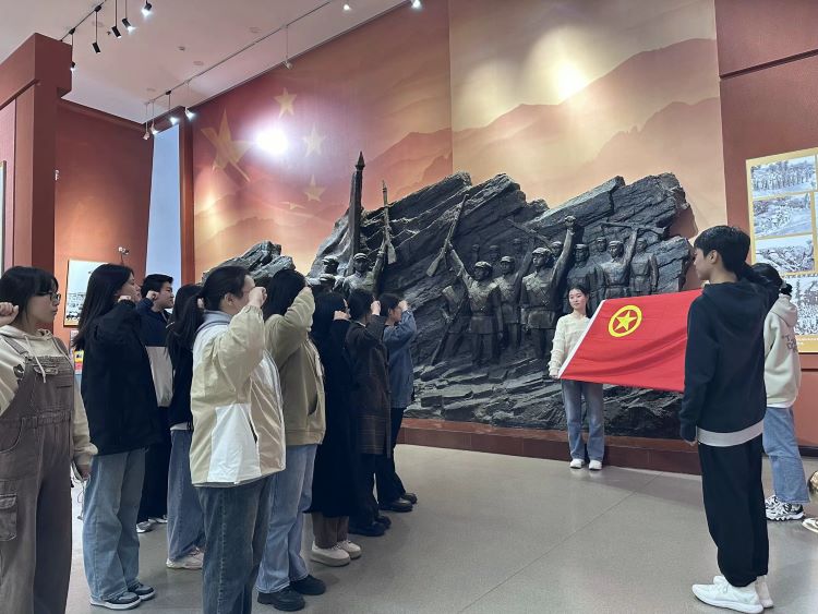 在信阳市浉河区鄂豫皖苏区革命纪念馆,同学们认真聆听讲解员讲述信阳厚重的革命历史,仔细观赏纪念馆内展示的鄂豫皖革命根据地各个时期的珍贵照片。这些照片不仅记录了革命先烈们英勇斗争的壮丽篇章,也展现了他们坚定的信念和无私的奉献精神。在参观过程中,队长李璞带领大家面向团旗庄重地重温入团誓词,号召全班同学缅怀革命先烈,铭记光辉岁月,凝聚奋进力量。同学们纷纷表示:通过此次活动,他们深刻感受到了中国共产党人始终不渝的初心和一心为民的使命,也更加坚定了自己的理想信念——将牢记历史,以共青团员的身份,赴时代之约,颂青春篇章!
