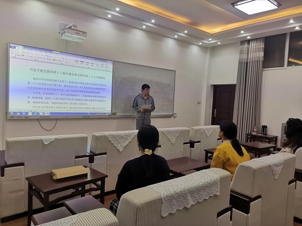会上,郑重老师分别对《习近平致全国青联十三届全委会和全国学联二十七大的贺信》和《唱响新时代爱国团结跟党走的青春之歌——在中华全国青年联合会第十三届委员会全体会议和中华全国员工联合会第二十七次代表大会上的致词》这两个文件进行领学,并就习近平总书记重要指示精神进行研读。