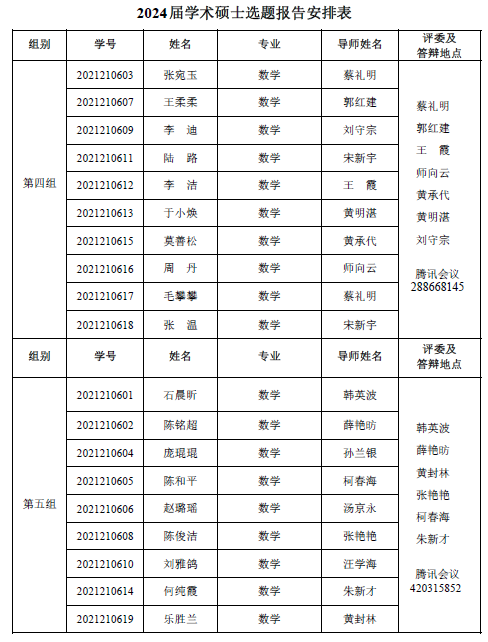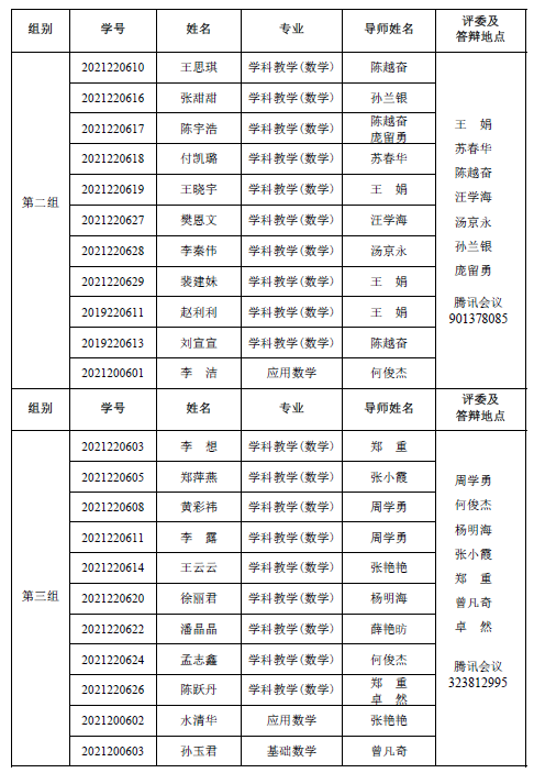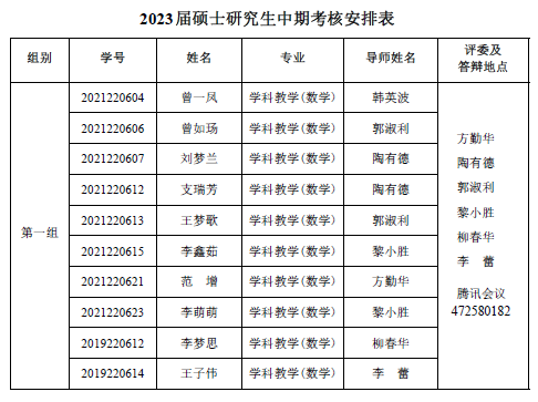 sunbet 2022-2023 学年第一学期 2021级专业硕士研究 生(两年制专业硕士)、2021 级同等学力研究生、2019 级硕师计划研 究生学位论文中期考核和 2021 级学术硕士研究生(三年制学术硕士)学位论文选题报告答辩会定于 2023年 1月 6日14:30—18:00在腾讯会议平台举行,具体分组见下表。参加答辩的同学需提前填写好《信阳师范学院硕士研究生学位论文选题报告》或《信阳师范学院硕士研究生中期考核表》,并按照选题报告或中期考核所列内容准备 12 分钟左右的汇报课件参加答辩,届时不参加答辩的同学视为考核不通过。