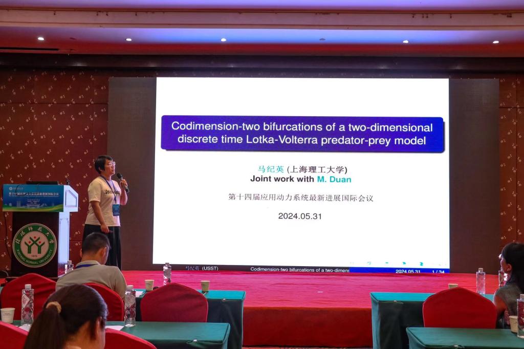 上海理工大学的马纪英,做了题目为《 Codimension-two bifurcations of a two-dimensional discrete time Lotka-Volterra predator-prey model》的报告。