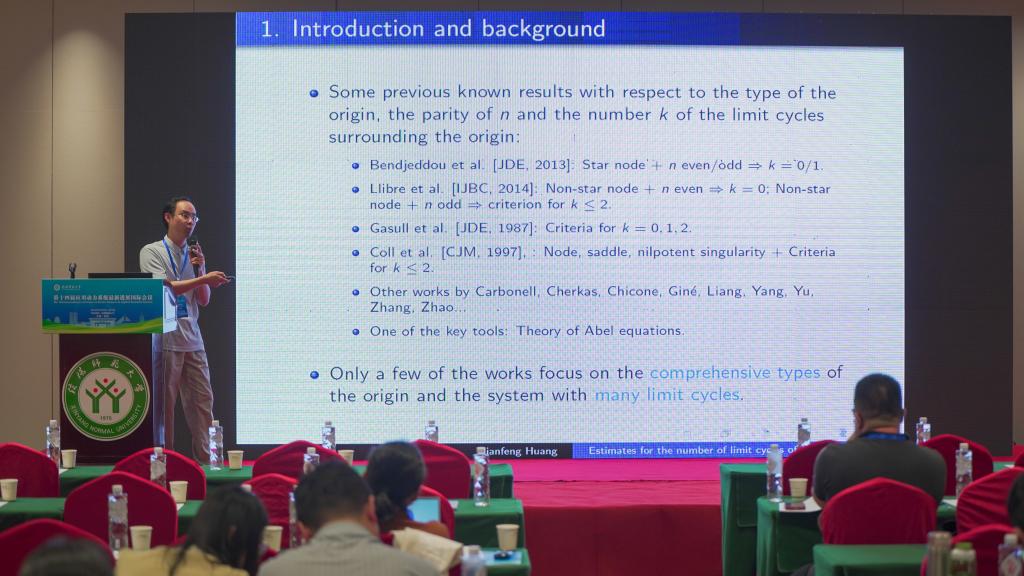 暨南大学的黄健沨,做了题目为《Estimates for the number of limit cycles of the planar polynomial differential systems with homogeneous nonlinearities》的报告。