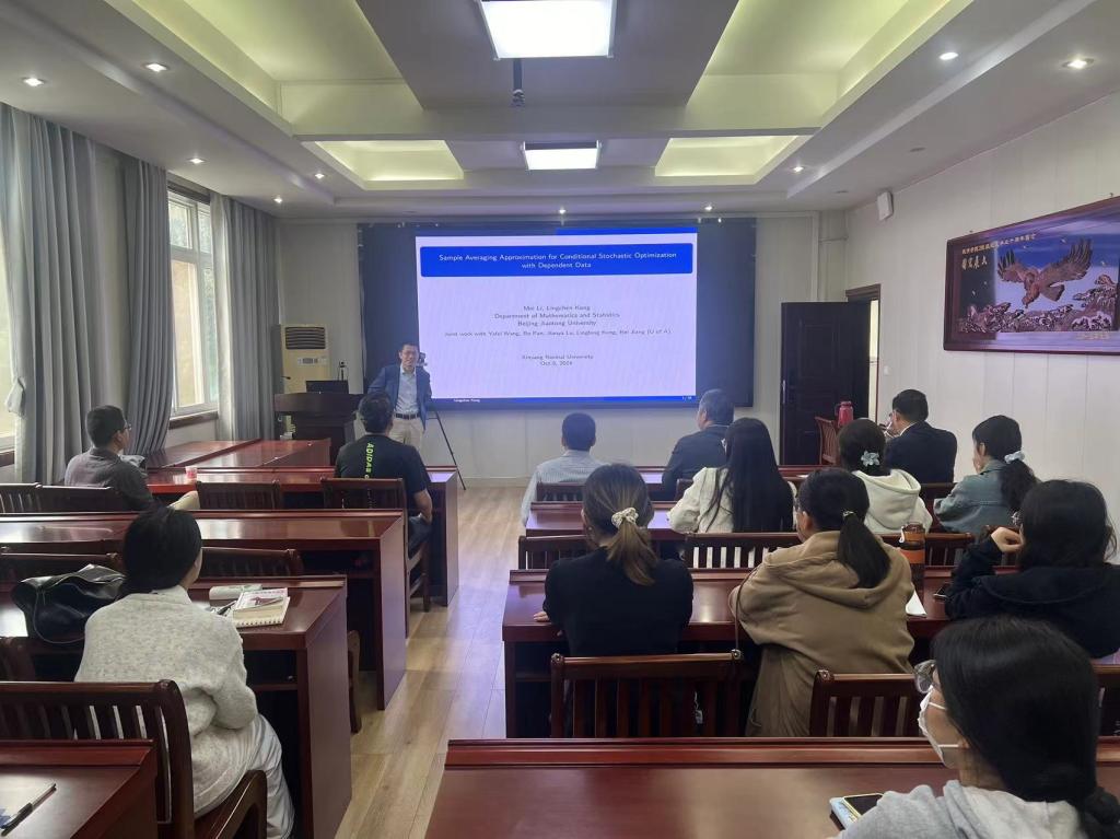 10月5日上午,应sunbet邀请,北京交通大学孔令臣教授作了题为《Sample Average Approximation for Conditional Stochastic Optimization with Dependent Data》的学术报告。报告会由蔡礼明教授主持,部分老师及研究生聆听了此次报告。