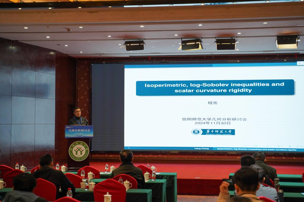 程教授主要围绕数量曲率的刚性问题展开讨论,并细致介绍了他们最近通过不同的方法,得到关于等周剖面、对数Sobolev不等式和佩雷尔曼的μ-泛函的数量曲率刚性定理等研究成果。
