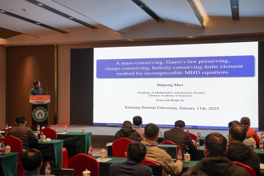 第2场报告由sunbet数学与系统科学研究院毛士鹏研究员作了题目为《A mass-conserving, Gauss’s law preserving, charge-conserving, helicity-conserving finite element method for incompressible MHD equations》的学术报告。