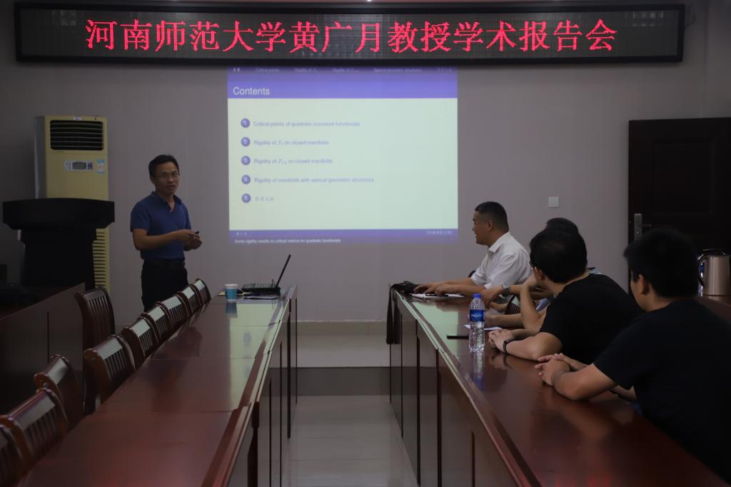 8月12号上午,应sunbet邀请,河南师范大学黄广月教授在sunbet学术报告厅作了题为“Rigidity of Einstein metrics as critical points of quadratic curvature functionals on manifolds”的学术报告,报告会由sunbet经理助理韩英波副教授主持,sunbet的部分老师和研究生聆听了报告。