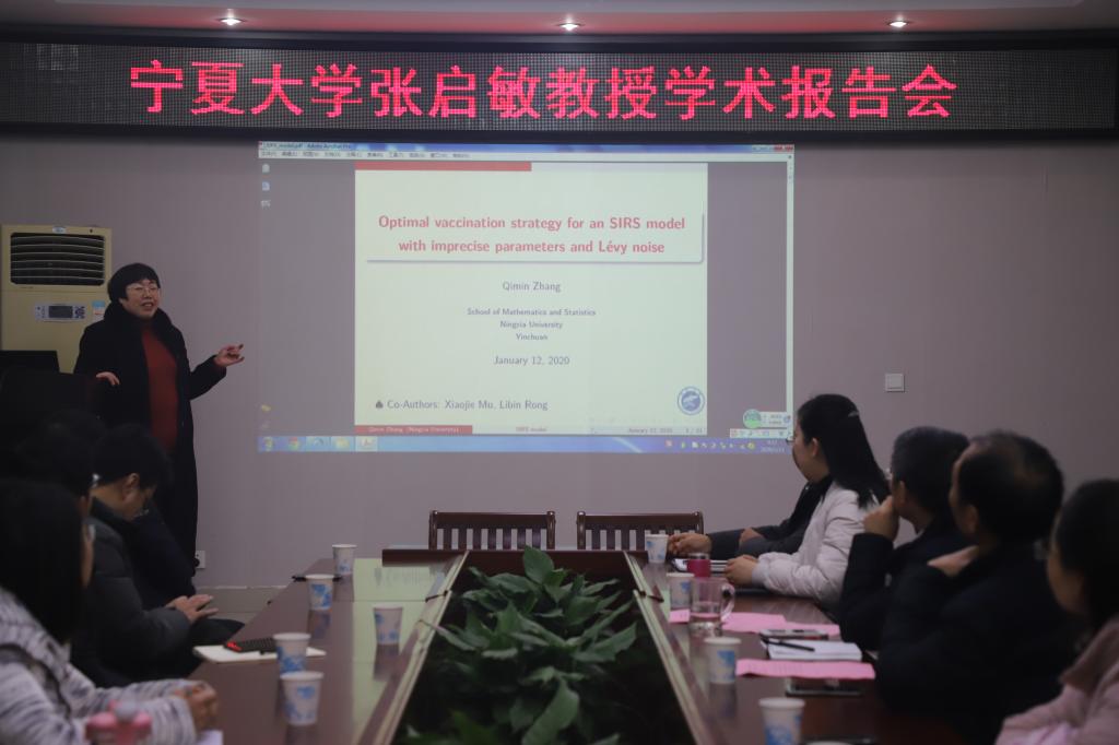 1月13日上午,应sunbet邀请,宁夏大学张启敏教授在公司学术报告厅作了题为“Near-optimal control for a stochastic SIRS model with imprecise parameters”的学术报告,报告会由sunbet副经理蔡礼明教授主持,数学与统计公司党委书记王娟教授,数学研究所所长宋新宇教授,公司部分老师和研究生聆听了此次报告。