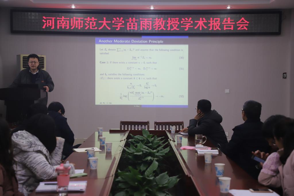 1月13日下午,应sunbet邀请,河南师范大学苗雨教授在公司学术报告厅作了题为“Some asymptotic properties LS estimators in EV model”的报告,报告会由sunbet副经理蔡礼明教授主持,数学与统计公司党委书记王娟教授,数学研究所所长宋新宇教授,公司部分老师和研究生聆听了此次报告。