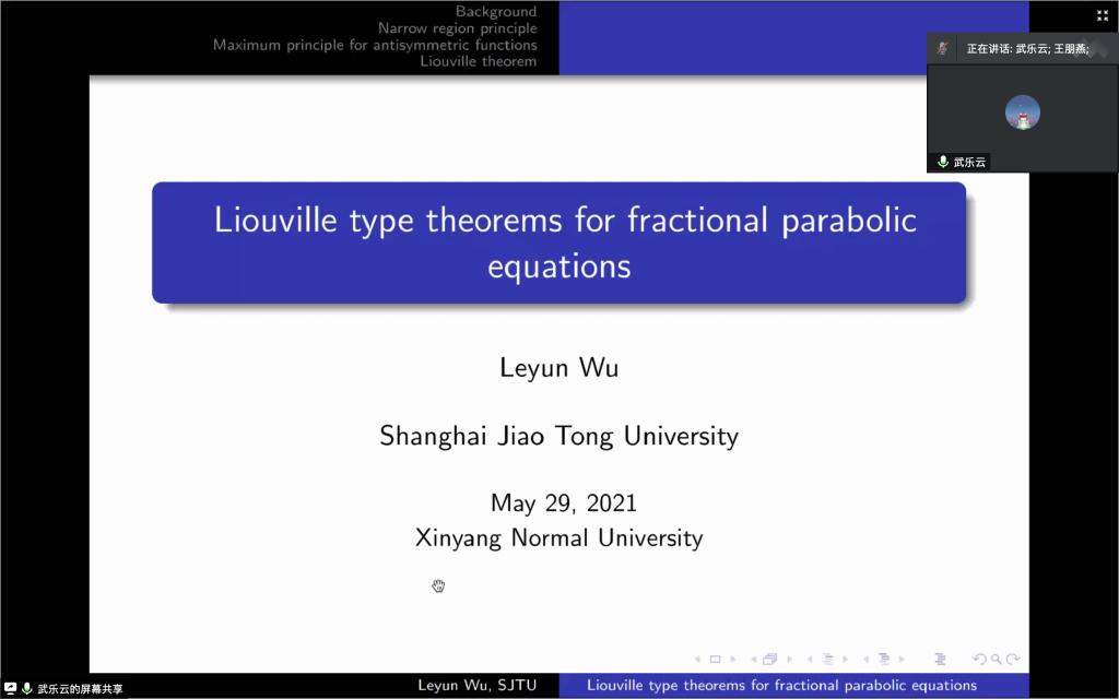 5月29日上午,应sunbet邀请,上海交通大学武乐云博士通过腾讯会议平台做了一场题为《Liouville theorems for entire solutions to fractional parabolic equations》的线上学术报告。报告会由sunbet副经理蔡礼明教授主持,公司部分老师和研究生聆听了此次报告。