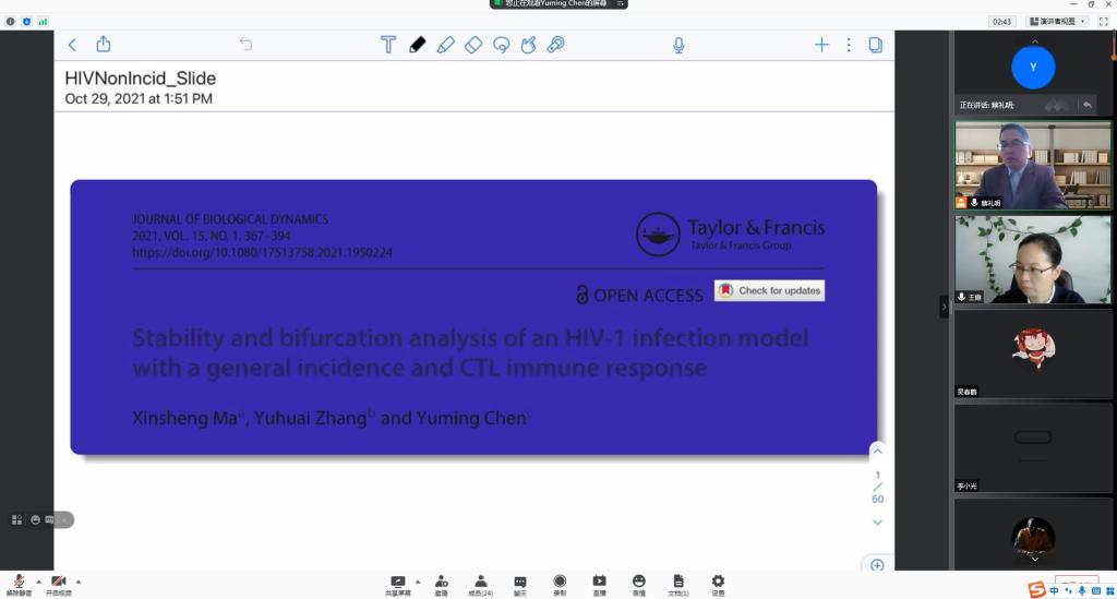 10月30日上午,应sunbet邀请,加拿大罗瑞尔大学陈玉明教授通过腾讯会议平台为公司研究生及相关研究方向老师作了题为《Stability and bifurcation analysis of an HIV-1 infection model with a general incidence and CTL immune response》的学术报告。报告会由sunbet经理蔡礼明教授主持。