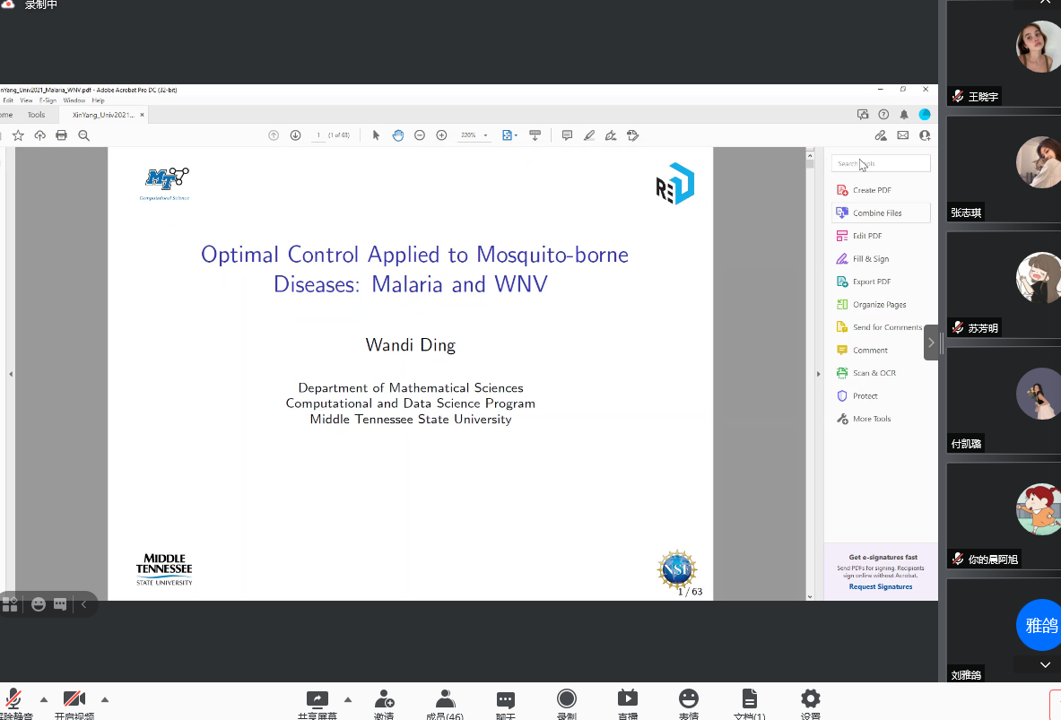 10月30日上午,应sunbet邀请,美国中田纳西州立大学丁婉菂教授通过腾讯会议平台为公司研究生及相关研究方向老师作了题为《Optimal control applied to mosquito-borne diseases: Malaria and WNV》的学术报告。报告会由sunbet经理蔡礼明教授主持。