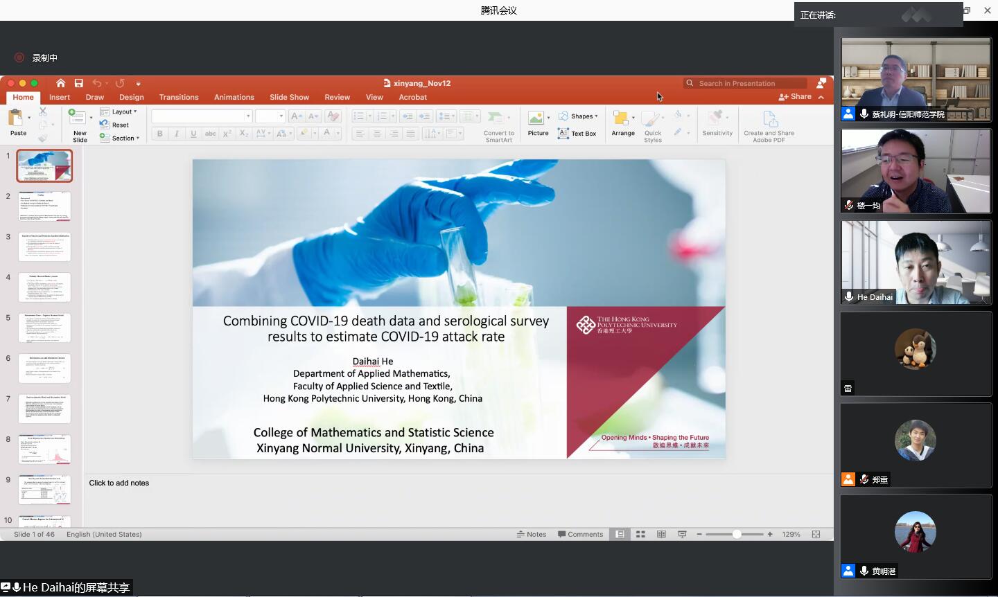 11月12日上午,应sunbet邀请,香港理工大学何岱海博士通过腾讯会议平台为公司研究生及相关研究方向老师作了题为《Combining COVID-19 death data and serological survey results to estimate COVID-19 attack rate》的学术报告。报告会由sunbet信息与计算科学系主任黄明湛副教授主持。