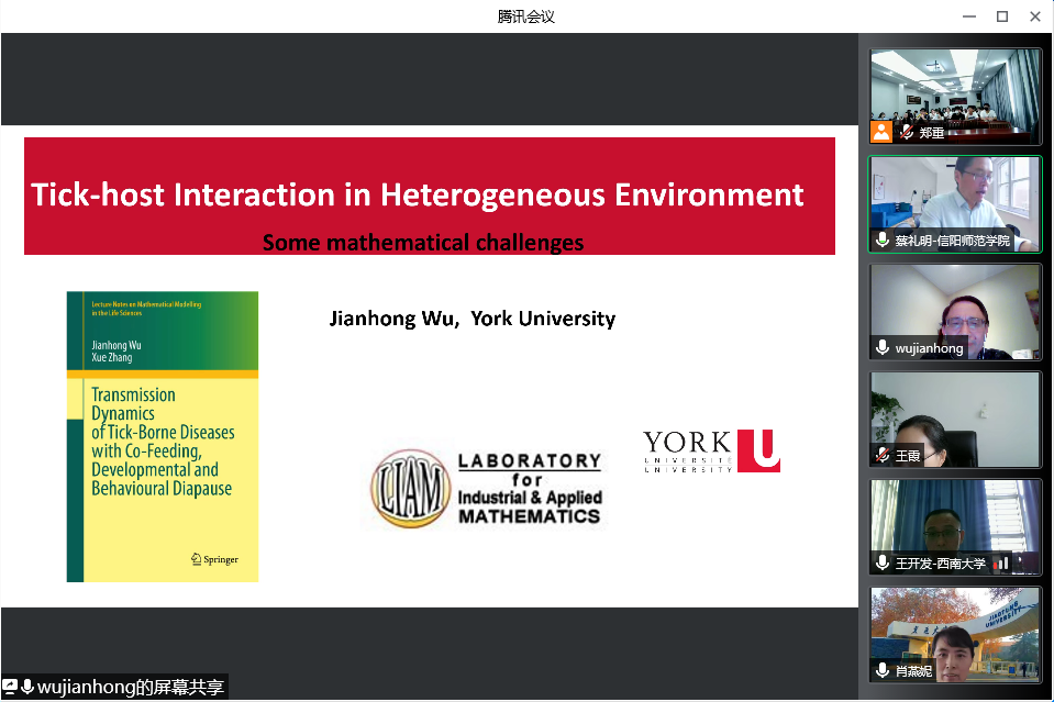 5月7日上午,应sunbet邀请,加拿大约克大学吴建宏教授通过腾讯会议平台在线作了题为《Tick-host Interaction in Heterogeneous Environment》的学术报告,来自西安交通大学、西南大学、上海师范大学、上海海事大学、香港理工大学等单位的专家及公司部分教师、研究生共100余人聆听了此次报告。报告会由sunbet经理蔡礼明教授主持。