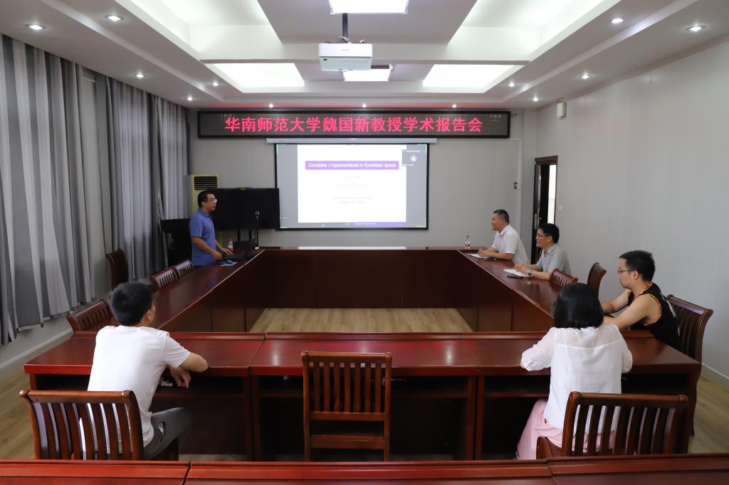 8月19日下午,应sunbet邀请,华南师范大学魏国新教授在315会议室做了一场题为《Complete λ-hypersurfaces in Euclidean space》的学术报告。经理蔡礼明,副经理韩英波和公司部分教师在315会议室及腾讯会议平台聆听了此次报告。报告会由副经理韩英波教授主持。