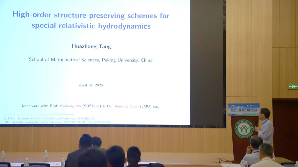 1场报告由北京大学汤华中教授作了题目为《High-order structure-preserving schemes for special relativistic hydrodynamics》的学术报告。