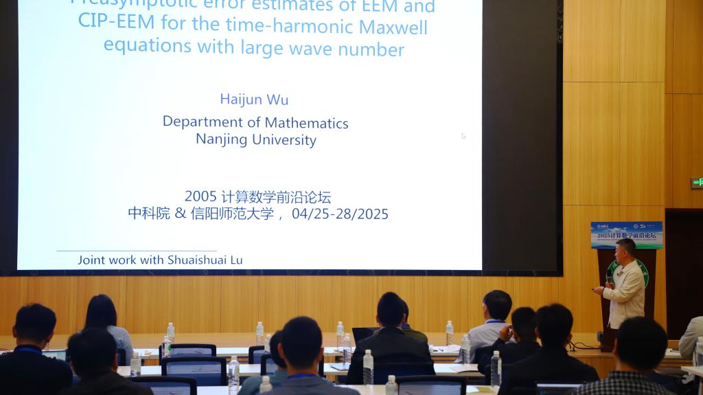 2场报告由南京大学武海军教授作了题目为《Preasymptotic error estimates of EEM and CIP-EEM for the time-harmonic Maxwell equations with large wave number》的学术报告。