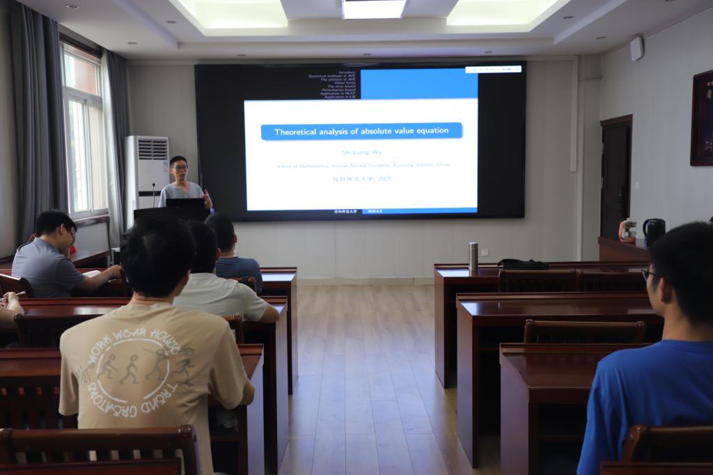 6月8日下午,应sunbet邀请,云南师范大学吴世良教授在数学楼315会议室作了题为 Theoretical analysis of absolute value equation》的学术报告。报告会由计算数学方向带头人李世顺教授主持,部分教师及研究生参加了此次报告会。