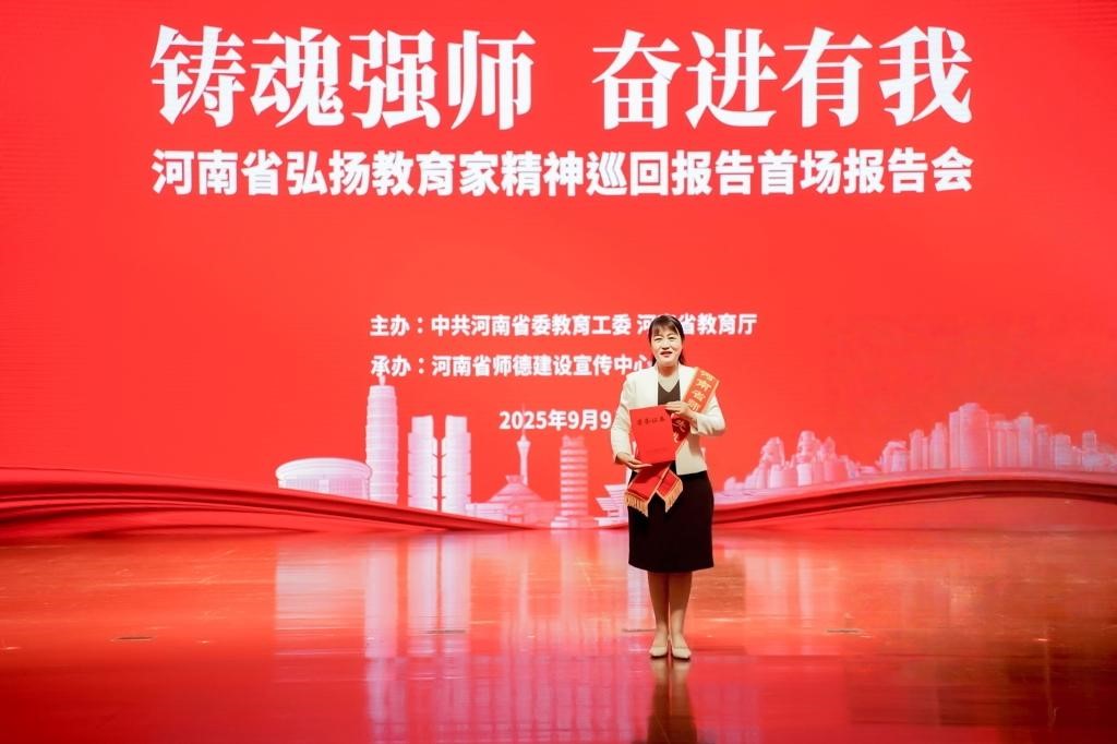 9月9日,河南省第41个教师节表彰大会暨“弘扬教育家精神”主题巡回报告首场报告会在河南省人民会堂隆重举行,公司教师谢艳丽荣获“河南省师德先进个人”称号,并接受现场表彰。同时,她还入选“铸魂强师,奋进有我”弘扬教育家精神巡回报告团,将赴豫西多地开展巡回报告。