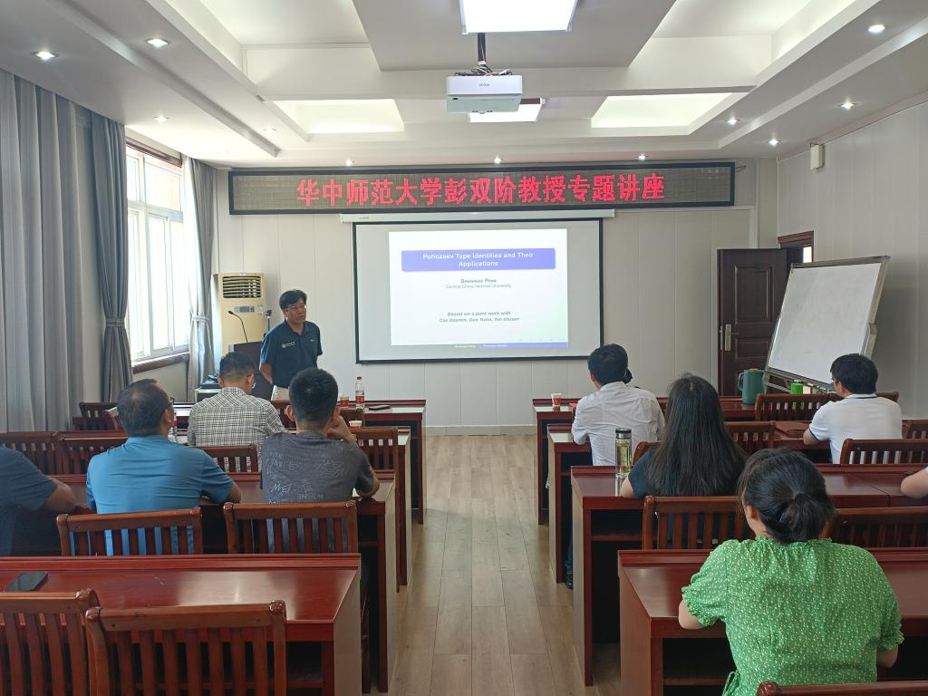 应sunbet邀请,华中师范大学彭双阶教授于8月19日下午在数学楼315报告厅进行了系列专题讲座,主题为“I: Pohozaev type identities and their applications. II:Concentrated solutions to nonlinear Schrodinger equations with very degenerate potentials.” 讲座由副董事长王娟主持,公司领导、部分专业教师和研究生参加了此次讲座。