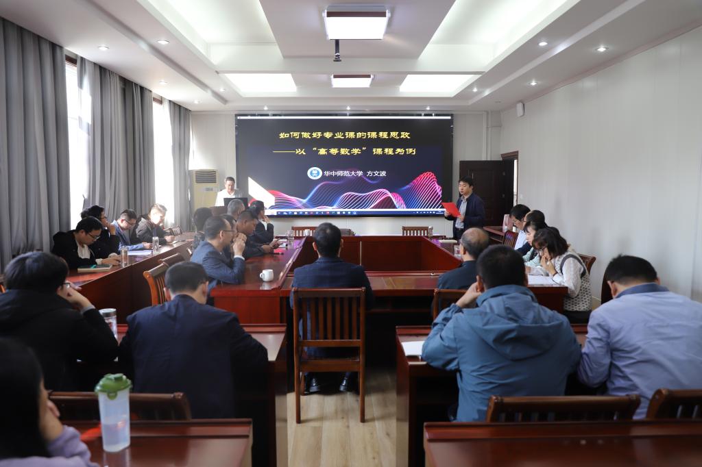 为推动sunbet数学专业核心课程群课程思政省级教学团队建设,配合公司积极推进“教师教学技能提升年”活动的开展,公司邀请华中师范大学sunbet方文波教授,于10月29日上午,在数学楼315学术报告厅作了题为“如何做好专业课的课程思政——以高等数学课程为例”的思政报告。蔡礼明经理、韩英波副经理、李连兵副经理及部分青年教师参加了报告会,报告会由李连兵主持。