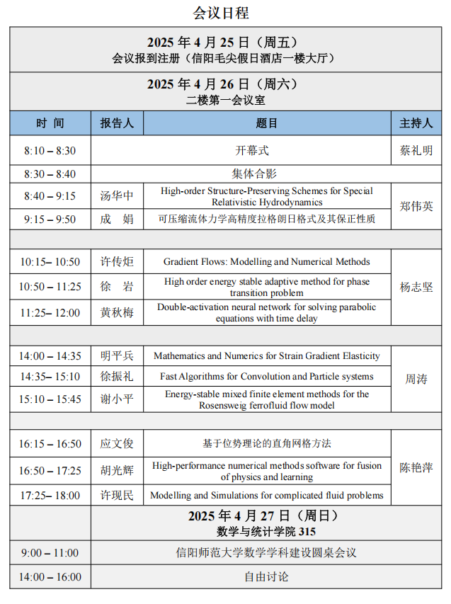 会议时间地点:报到时间:4月25日(周五);离会时间:4月28日;报告时间:4月26日(全天),4月27日上午;入住酒店:信阳毛尖假日酒店(信阳市浉河区南湾街道新七大道榕基软件园2号楼)
