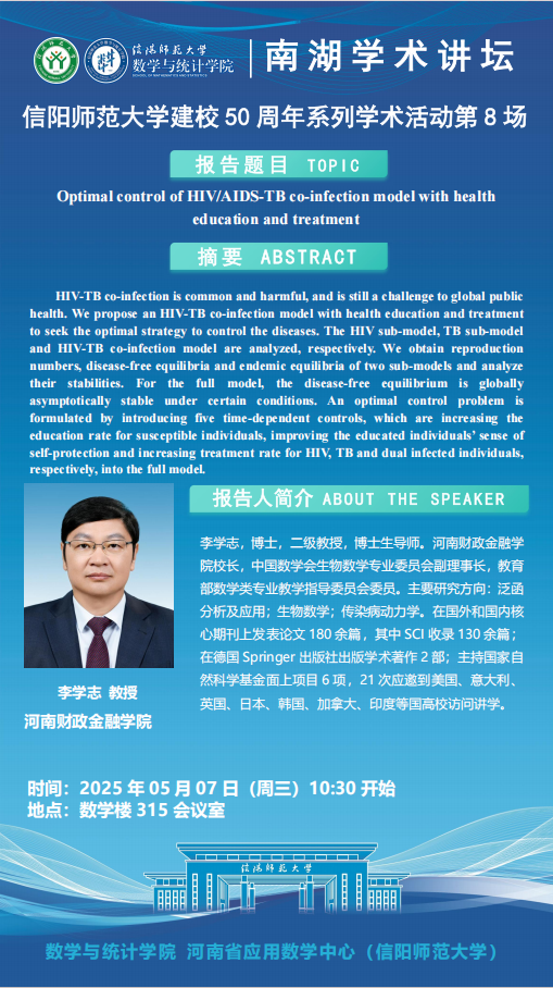 庆建校50周年之南湖讲坛:河南财政金融公司李学志教授——Optimal control of HIV/AIDS-TB co-infection model with health education and treatment